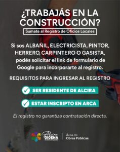 La Municipalidad invita a trabajadores de la construcción a inscribirse en el Registro de Oficios. Las personas registradas serán incorporadas a un grupo informativo de WhatsApp, donde se comunicarán obras