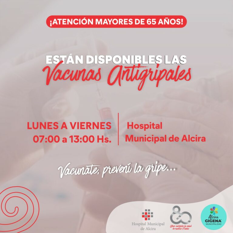 Invitamos a todas las personas mayores de 65 años a acercarse al Hospital Municipal de Alcira de lunes a viernes desde las 07:00 a 13:00 Hs para vacunarse contra la gripe.