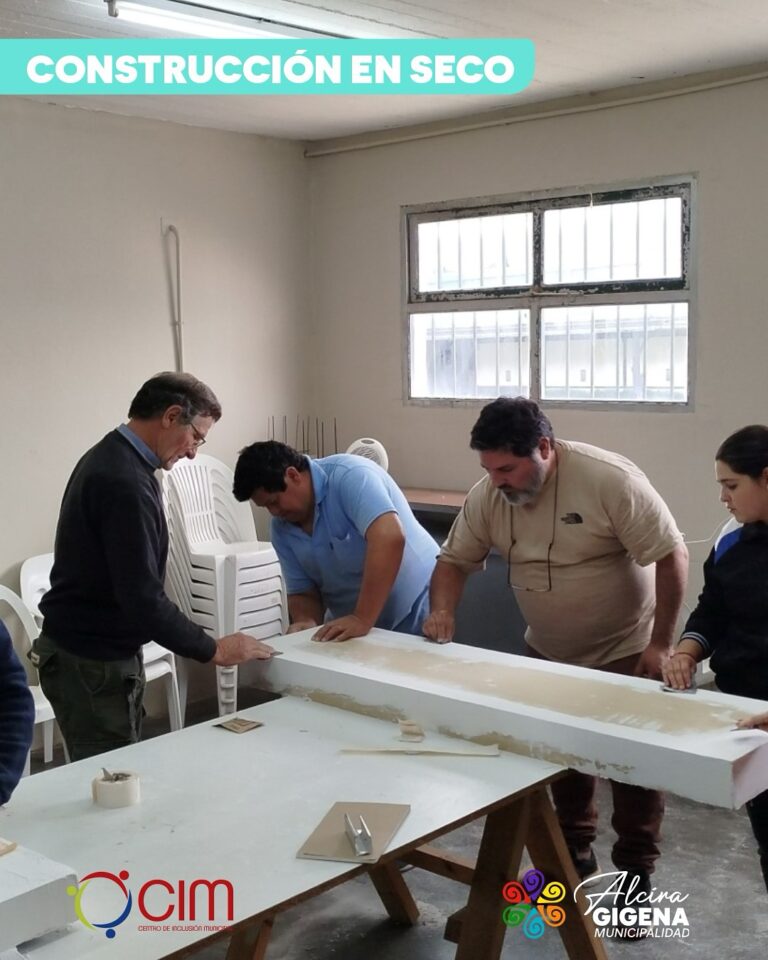 Todos los martes y jueves en el CIM, Darío Gilardini acompaña a las y los participantes en el aprendizaje de técnicas de construcción en seco, manejo de herramientas, uso de masilla y armado de estructuras.