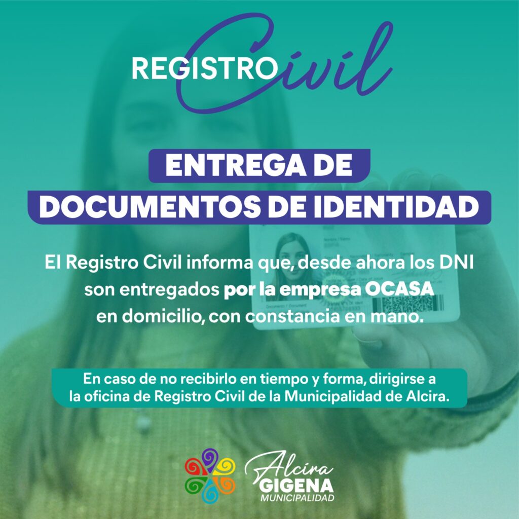 La Municipalidad de Alcira comunica que a partir de ahora los nuevos DNI ya no se retirarán en el Municipio. La entrega se realizará directamente en el domicilio declarado, a