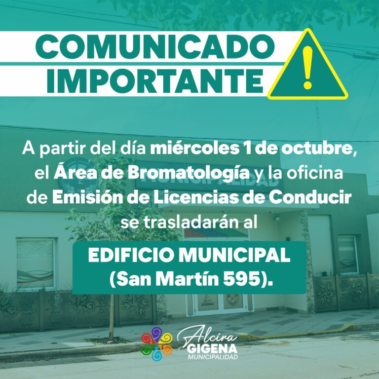 A partir del miércoles 1 de octubre, el Área de Bromatología y la oficina de Emisión de Licencias de Conducir funcionarán en el Edificio Municipal (San Martín 595).