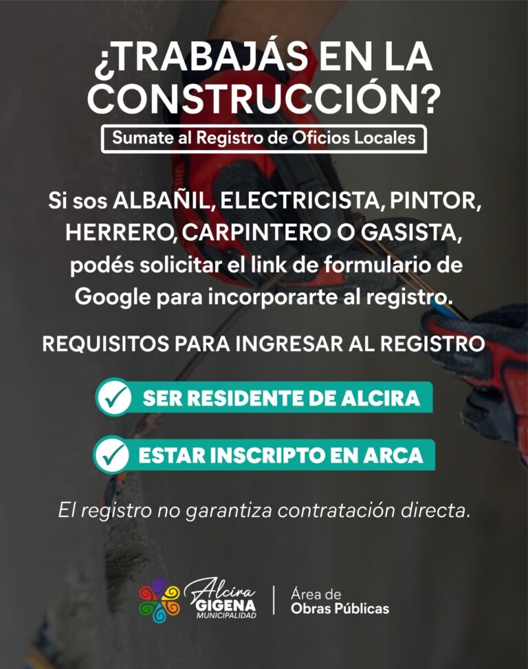 La Municipalidad invita a trabajadores de la construcción a inscribirse en el Registro de Oficios.